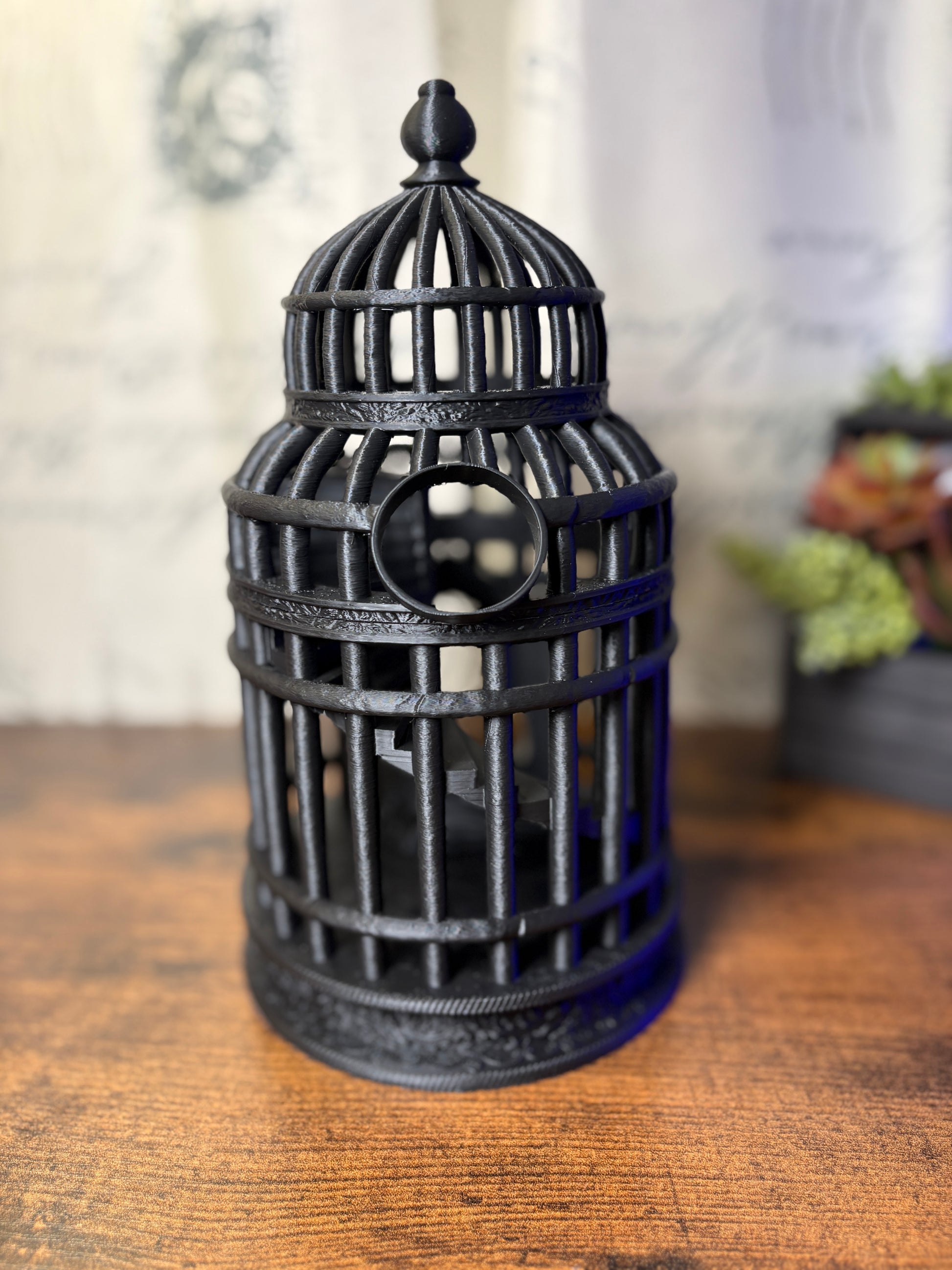 A beautiful and highly detailed birdcage with a dice tower (access in the back) and a separate area for your misbehaving dice. The top is magnetically attached, and can be easily removed to remove your jailed dice collection.